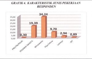 Berdasarkan responden yang mengisi kuesioner kepuasan pelanggan mengenai data pekerjaan sebanyak 375 responden. Hasil analisis menunjukkan bahwa jenis pekerjaan paling dominan adalah pegawai swasta yaitu 34,24%. Secara lengkap dapat dilihat pada grafik berikut :