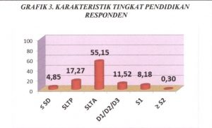 Responden yang mengisi kuesioner kepuasan pelanggan mengenai data pendidikan sebanyak 375 responden. Hasil analisis menunjukkan bahwa sebagian besar responden mempunyai tingkat pendidikan SLTA atau sederajat sebanyak 55,15%. Secara lengkap dapat dilihat pada grafik berikut :