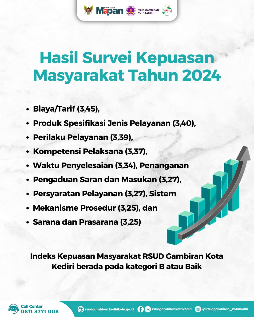 Indeks Kepuasan Masyarakat yang diselenggarakan oleh Pemerintah, RSUD Gambiran Kota Kediri pada tahun 2024 berada pada kategori B atau Baik. Sembilan unsur pelayanan yang berada pada RSUD Gambiran masih berada pada kategori B atau masih memerlukan perbaikan untuk menyempurnakan kualitas pelayanan. Adapun kesembilan unsur tersebut beserta capaian angkanya yakni sebagai berikut :
