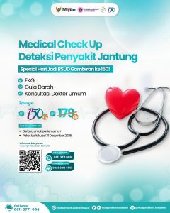 Dalam upaya meningkatkan deteksi dini penyakit jantung, RSUD Gambiran menghadirkan paket MCU Deteksi Penyakit Jantung seharga Rp150rb dari Rp179rb . Paket ini meliputi pemeriksaan EKG, gula darah, serta konsultasi dokter umum. Program ini mendorong masyarakat untuk lebih waspada dan peduli terhadap kesehatan jantung sebagai salah satu faktor penting dalam mencegah penyakit tidak menular.